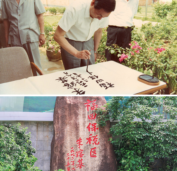 深圳是国内最早开始探索保税政策的城市,福田保税区则是深圳最早建成并投入使用的保税区。原国务院总理朱镕基分别于1992年和1997年两次莅临福田保税区考察,一向主张只签名不题词的朱镕基总理原本并不打算为保税区题词,但在在他签写自己的名字后,一旁的观众掌声雷动,经久不息,总理着实是性情中人,为此破例下笔题写了“福田保税区”五个大字。当时总理乐呵呵地开玩笑道:“这个字的版权是我的,很值钱的。”当时在观众席中的好博老员工每次向别人解释总理题词原稿中名字在右,而“福田保税区”在左的原因时,总是带着骄傲的语气。总理体“福田保税区”至今沿用于保税区内各标志性景观。