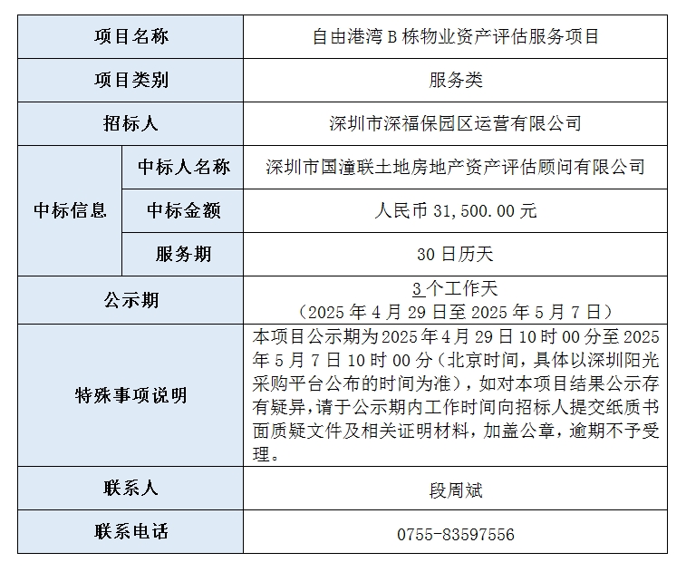 园区公司关于自由港湾B栋物业资产评估服务项目已完成评审及定标,现将本项目评审的相关情况及定标结果进行公示如下: